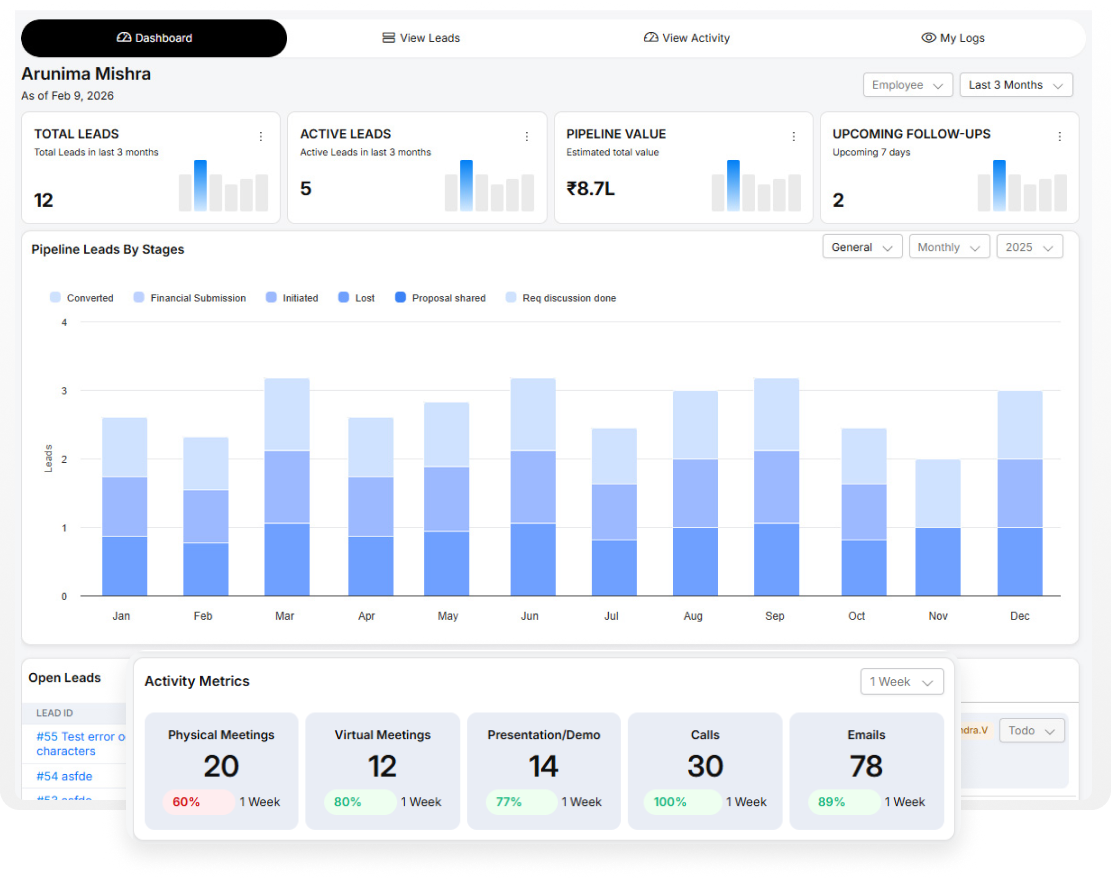 Get a real-time snapshot of leads, performance, and priorities in one intuitive view. Make faster decisions with clear insights and actionable metrics.